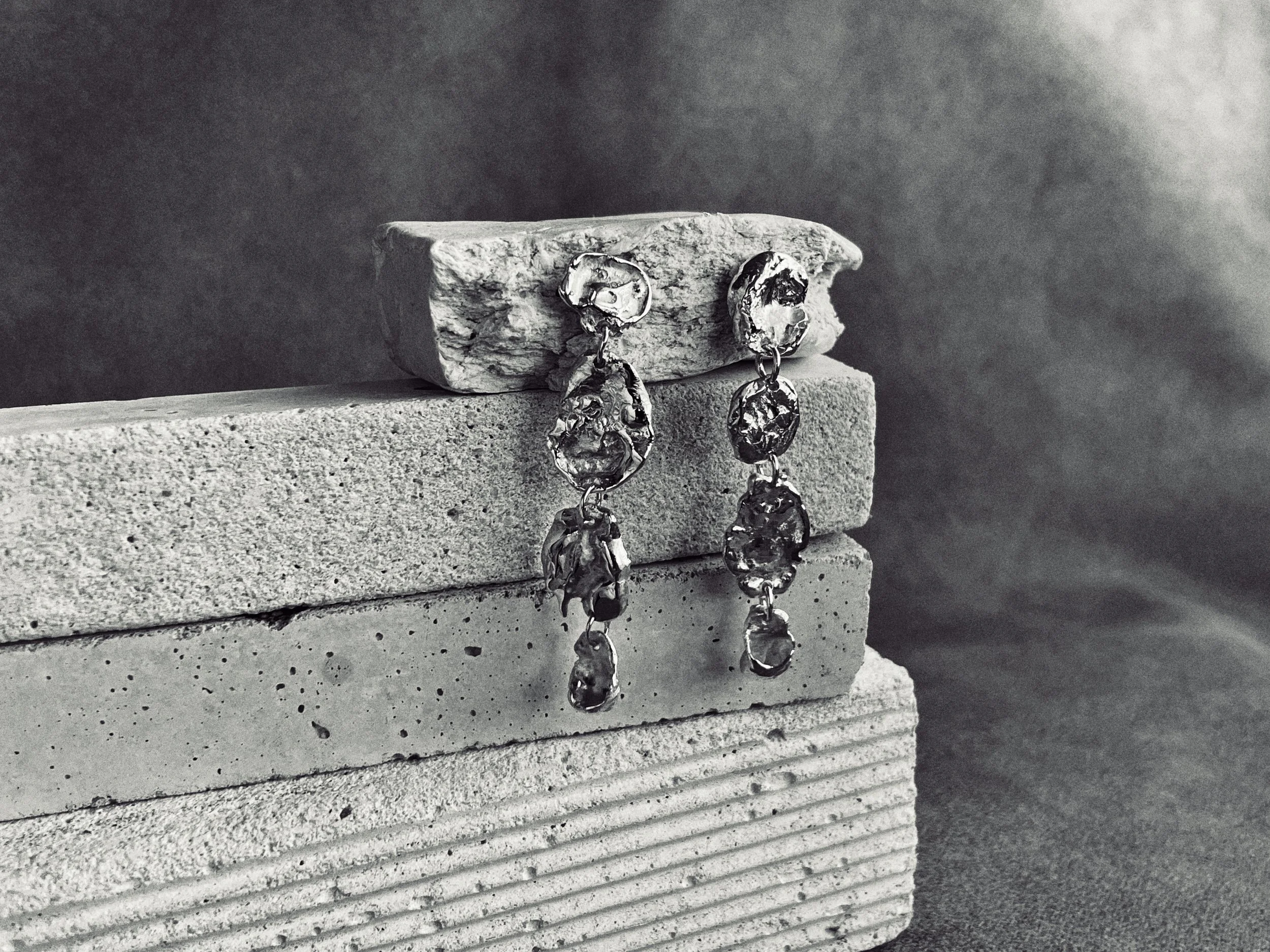 Water casting is the quenching of molten metal into water. The metal is rapidly cooled, resulting in organic frozen forms. Hand crafted from recycled sterling silver.
